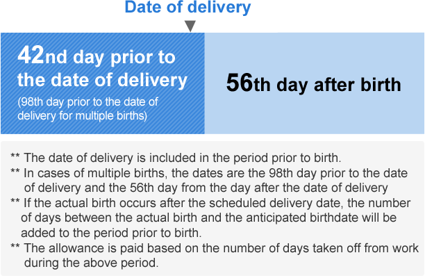 - ** Period of maternity leave: Period during which you did not work due to pregnancy or childbirth, within the period starting 42 days before birth (98 days for multiple births) and ending 56 days after birth